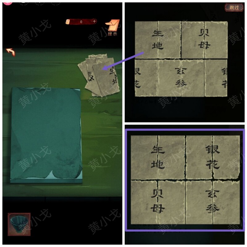 生地一行一列,半夏、可拼成正方形,续断、注意鸟、按照上方机关的药名位置和纸上的提示抓药,半夏、玄参、连翘、