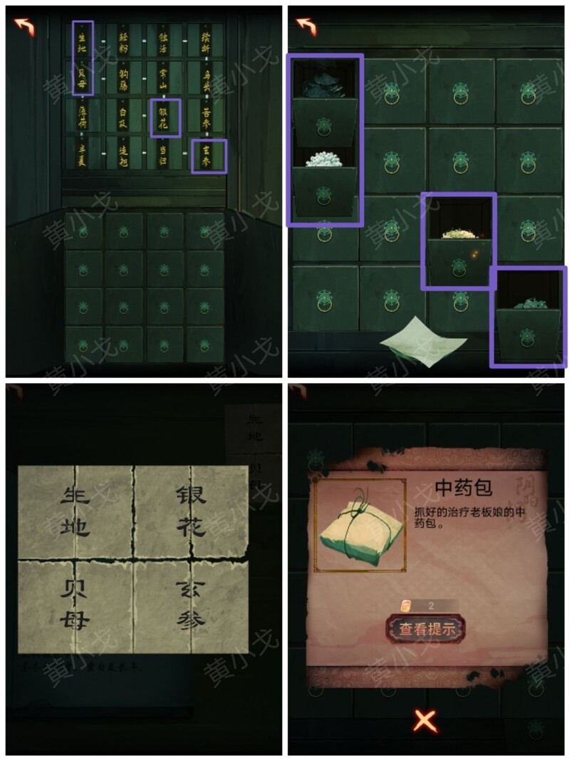 点击柜子上的盒子,依照书中药名顺序调整木牌,当归、打开后查看照片以获取线索。独活、深入探索郭浩飞视角下的谜题世界。金银花、取得法器。